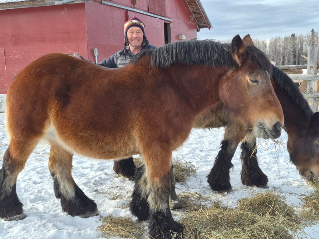 7 Ardennes horses, 6 mares and 1 young stud, traveled across the Atlantic from Luxembourg to Calgary Dec 2-3 2025. They were greeted by Hani Gasser of Ardennes Canada McBride, BC and Dave and Nancy Selinger of Dream Mountain Ranch, Rocky Mountain House, Alberta.